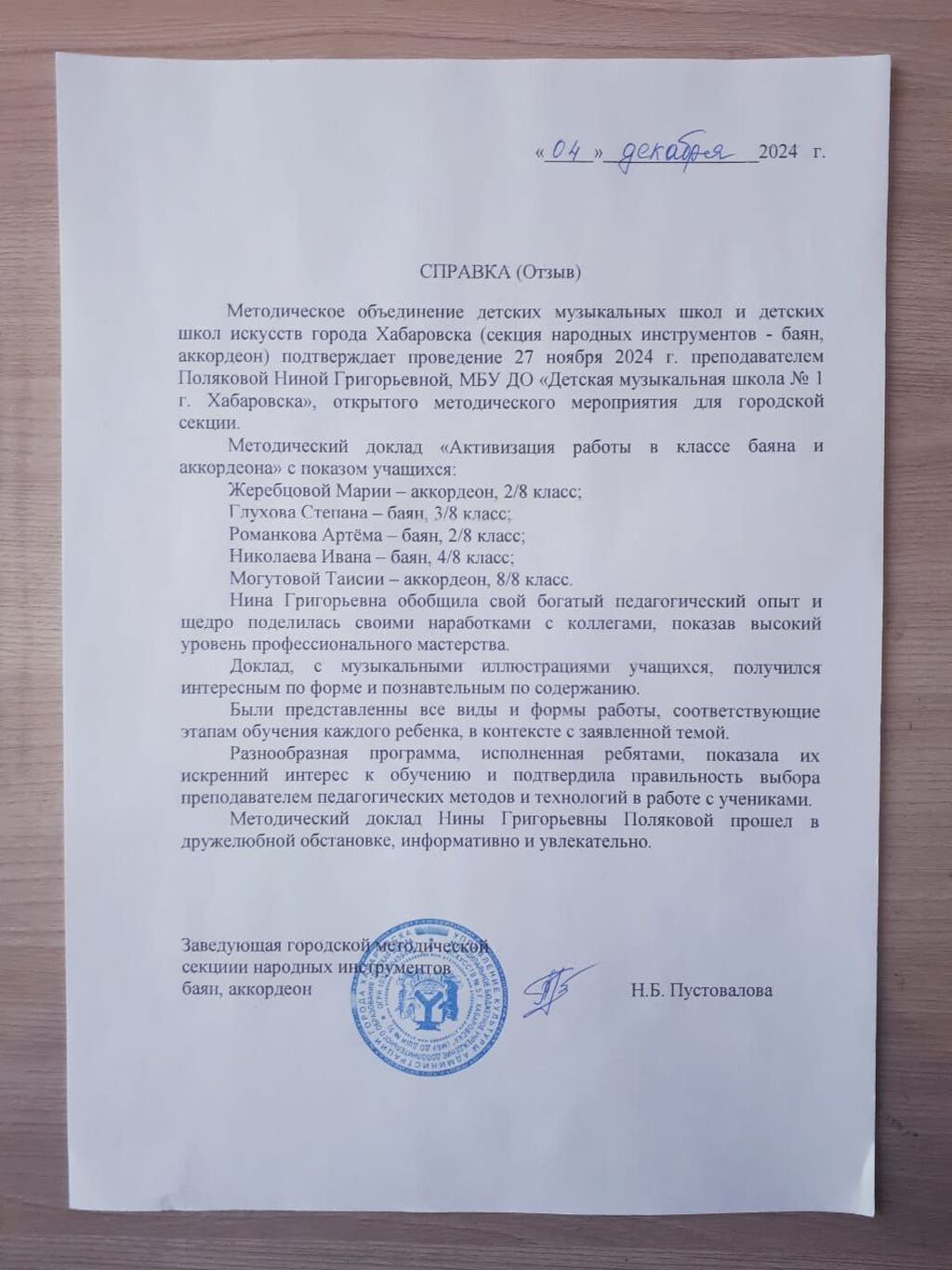 В докладе для коллег Нина Григорьевна отметила, что дополнительная предпрофессиональная общеобразовательная программа "Народные инструменты", рассчитанная на 8 лет обучения, в течении всех лет гармонично развивает учеников и даёт им профессиональные навыки, необходимые для поступления в учебные заведения культуры и искусства, что доказал выпуск 2023 и 2024 годов.
